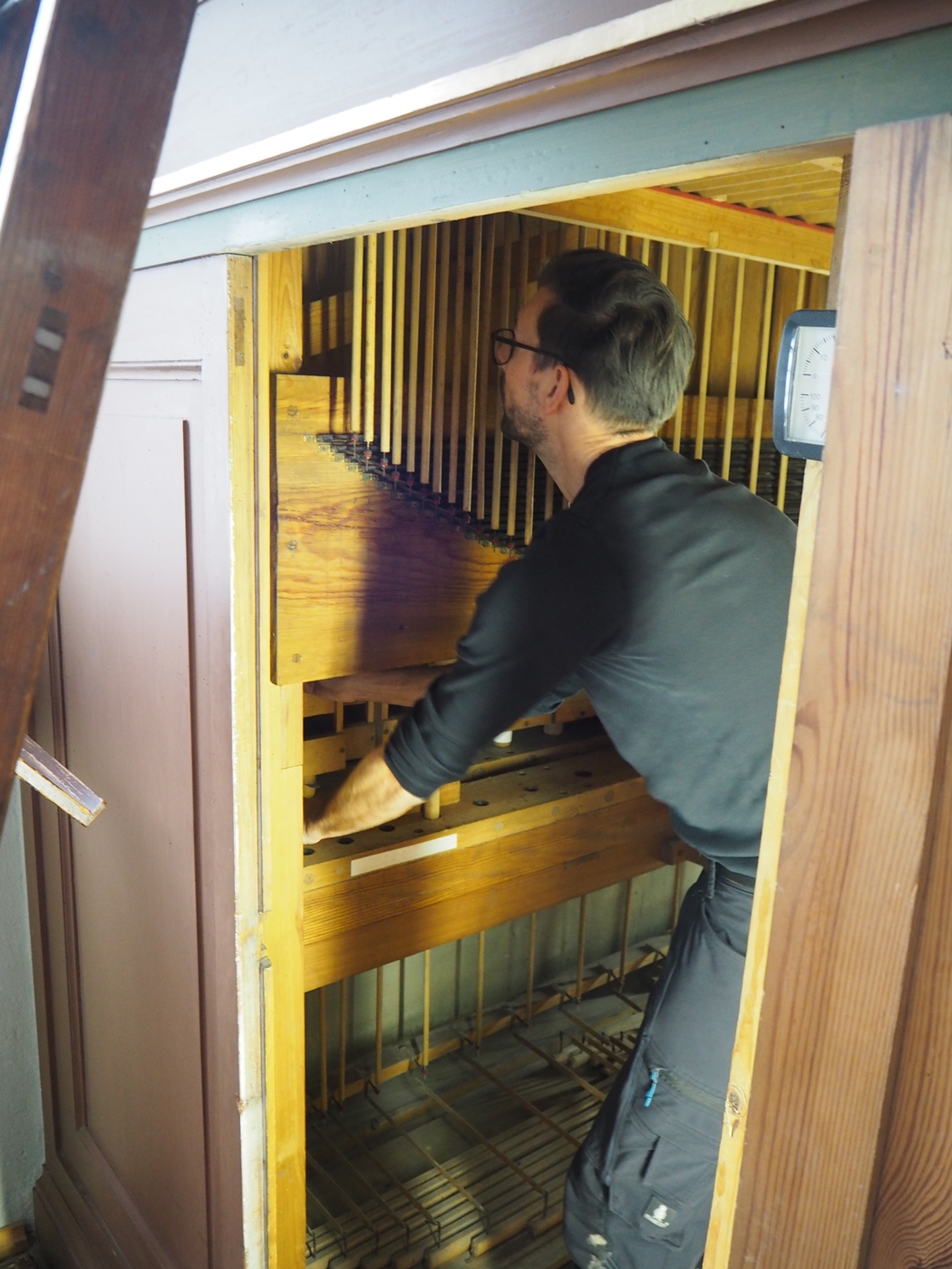 Nachdem dies erledigt war, wurden die Pfeifen in der Werkstatt vorintoniert, dann nach Albernau gebracht und schließlich im Raum klanglich an die Gesamtorgel angepasst. Es ist erstaunlich, wie konzentiert der Basston geworden ist und welches Volumen mit ihm der gesamte Orgelklang bekommt.
