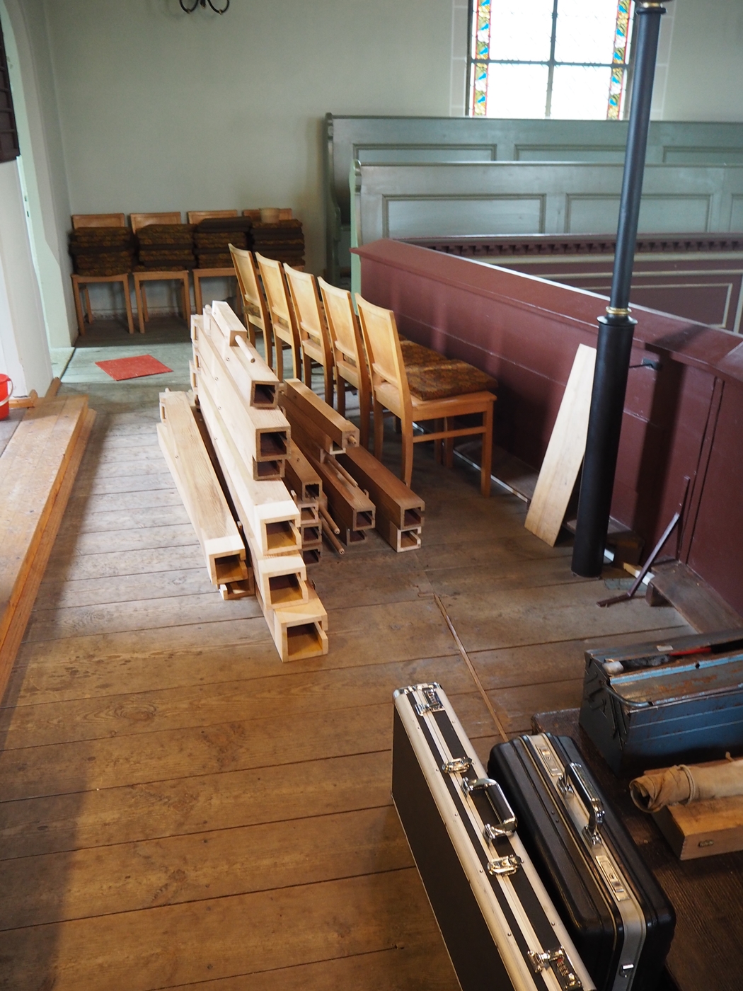 - Einkürzen der überlangen Pfeifenfüße, damit die Pfeifen insgesamt tiefer stehen, direkter Klang abstrahlen können und auch besser gestimmt werden können
