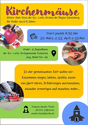 Wir freuen uns auf eine schöne gemeinsame Zeit, in der wir singen, spielen und von Gott hören. Außerdem ist bei einem kleinen Imbiss natürlich auch wieder genug Zeit zum Austausch. Wir treffen uns im Kinder- und Jugendhaus der Kirchgemeinde in Zschorlau.
